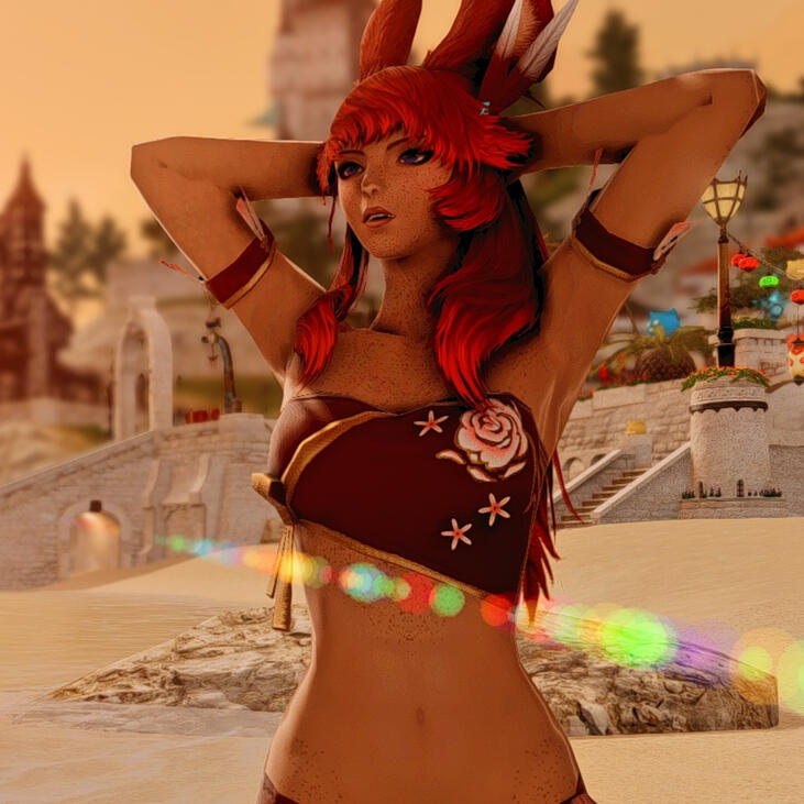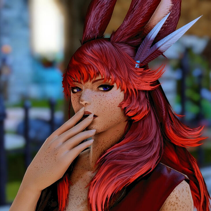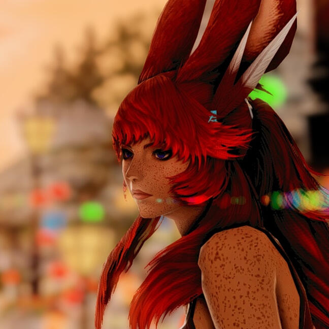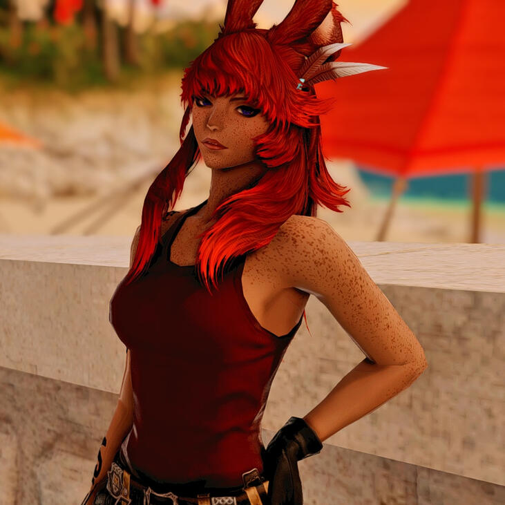 She never shows it, but she's still in pain after losing the only man she loved in her entire life. They flew together in the war as wingmen. When calamity struck, his airship was hit and crashed somewhere around Mor Dhona. The Viera pilot tried to come back for him, but her ship got hit pretty badly as well, barely gliding back to base. Rory has been looking for his body for many turns, without success.